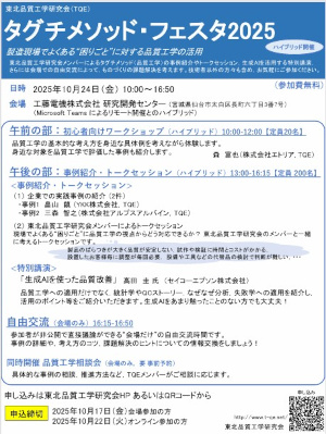 ここでは、東北品質工学研究会主催の、機能性評価祭りをはじめとするイベントの他、東北品質工学会以外が主催するセミナー等、品質工学に関する学習や最新情報の収集を行うことができる場を紹介します。